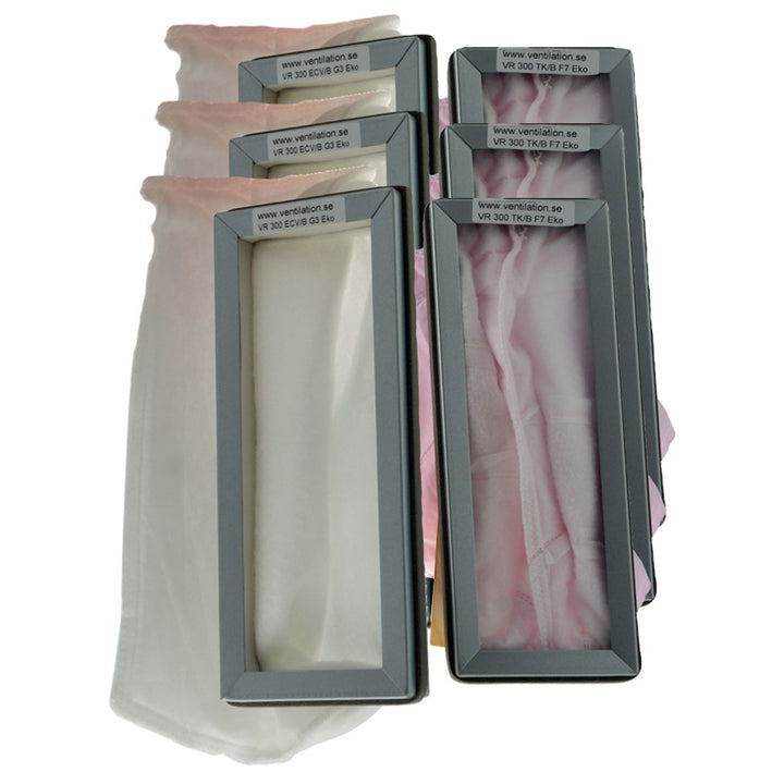 3-pack filter bestående av 3st tilluftsfilter BFVR 300 TK/B EU7 105x275x510/2 (art.nr:12467) och 3st frånluftsfilter VR 300 EC G3 275x115x220 (art.nr:206789) som passar till Systemair VR 300 EC. Paketet innehåller 6st filter. Ersätter originalfilter och kommer från en ledande filtertillverkare som levererar filter till den nordiska marknaden. Därmed håller de minst samma kvalité som så kallad originalfilter. Ventilationsfilter i bra kvalité till rätt pris.