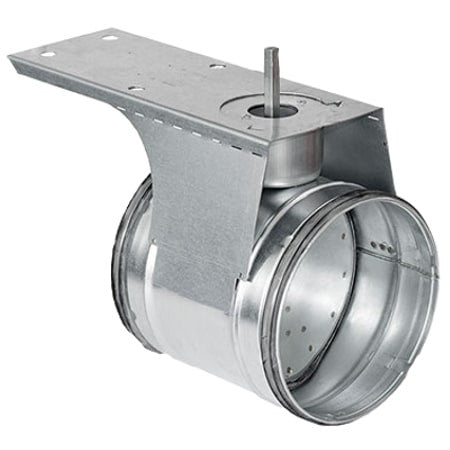 Trottelspjäll för cirkulära kanaler. Levereras som standard med förberett för 50 mm isolering och med motorhylla som är graderad 0 till 90 grader.