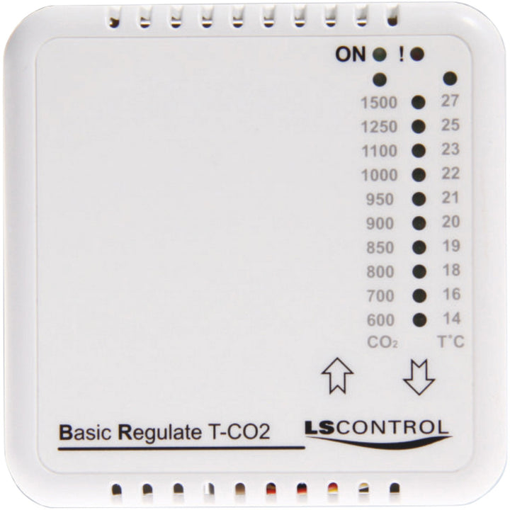 Regulator med inbyggd CO2 och temperaturgivare samt larmlampa. Regulatorn ger en 0-10V utsignal till fläkt, spjäll eller annan utrustning som fungerar med 0-10V reglersignal. Justeringsområde för CO2 är 600-1500 ppm och för temperatur 14-27°C